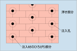 ■ピンニング工法はエポキシ樹脂材注入だけではなく、ステンレスピンの挿入を併用して躯体の浮き部を強力に接着させる高耐力のある方法です。又、張り替え工事に比べて工期の短縮、工事費の節約になります。